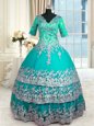 Fantastic Satin V-neck Half Sleeves Zipper Beading and Lace and Appliques and Ruffled Layers Sweet 16 Dress in Turquoise