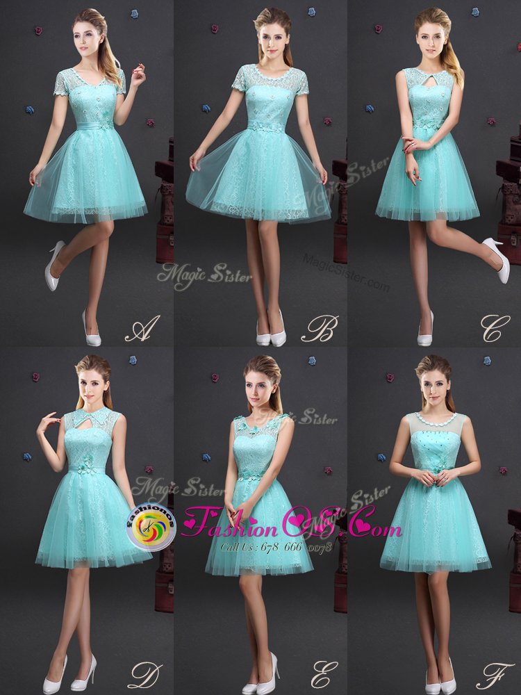 Home >  Special Occasion Dresses >  New Style Dama Dresses > Fantastic Scoop Aqua Blue Lace Up Quinceanera Court of Honor Dress Beading and Lace and Appliques and Belt Sleeveless Mini Length
