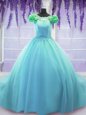 Fantastic Scoop Blue Tulle Lace Up Vestidos de Quinceanera Short Sleeves Court Train Hand Made Flower