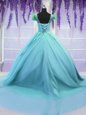 Home >  Quinceanera Dresses >  Pretty Quinceanera Dresses > Fantastic Scoop Blue Tulle Lace Up Vestidos de Quinceanera Short Sleeves Court Train Hand Made Flower