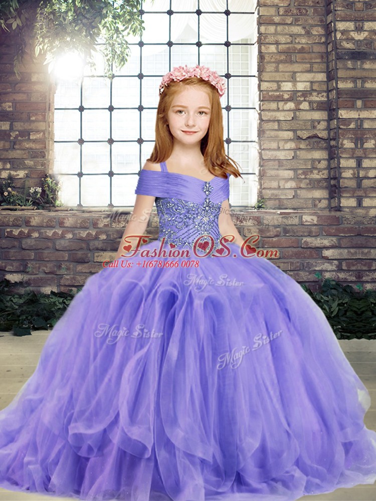 Home >  Special Occasion Dresses >  Lovely Little Girl Pageant Dresses > Fantastic Sleeveless Taffeta and Tulle Floor Length Lace Up Little Girls Pageant Dress in Lavender with Beading
