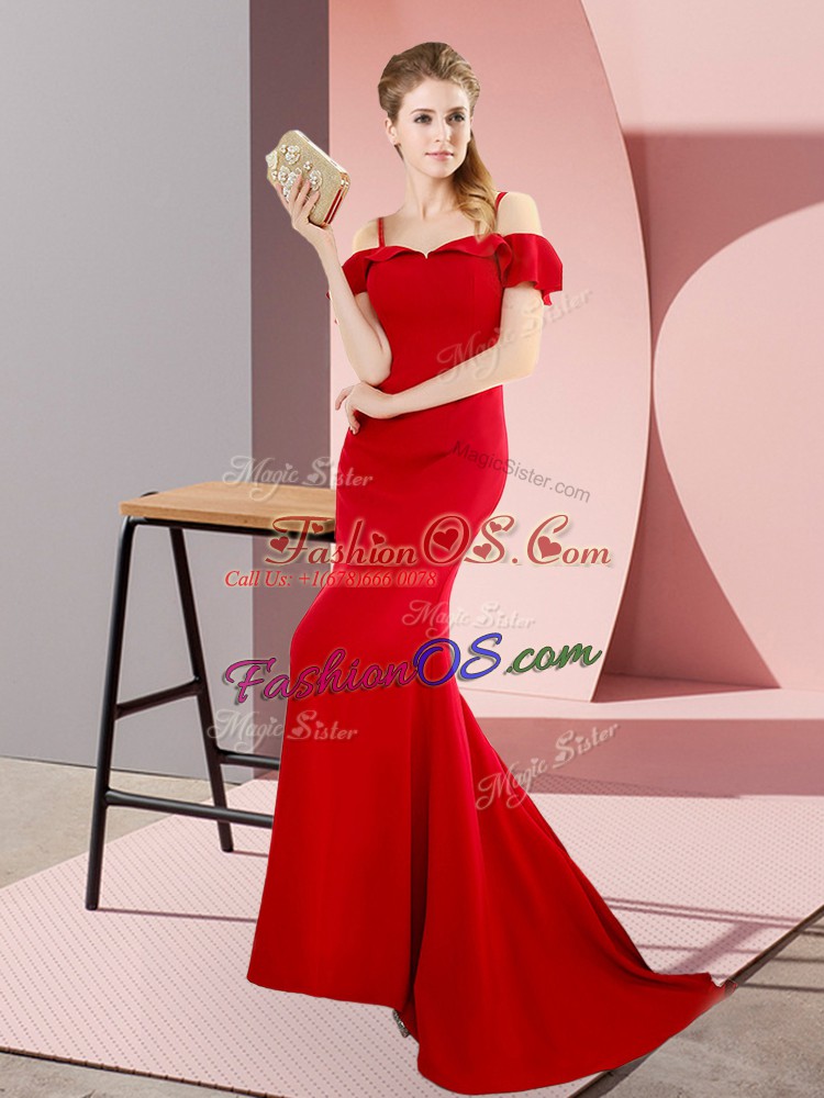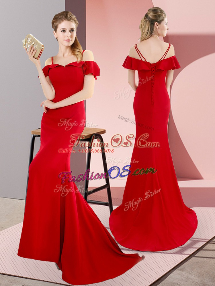 Home >  Prom Dresses >  Perfect Prom Dresses > Fantastic Straps Sleeveless Sweep Train Lace Up Evening Dress Red Satin