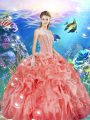 Fantastic Watermelon Red Sleeveless Beading and Ruffles Floor Length Quince Ball Gowns