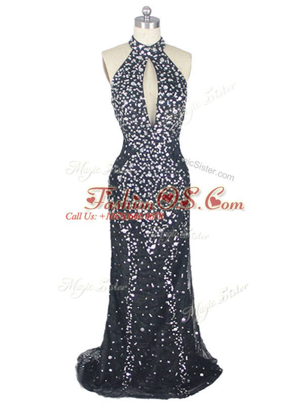Fashion Black Halter Top Zipper Beading Prom Party Dress Brush Train Sleeveless