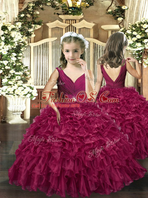 Home >  Special Occasion Dresses >  2018 Little Girl Pageant Dresses > Fashion Burgundy V-neck Neckline Beading and Ruffles Little Girl Pageant Dress Sleeveless Backless