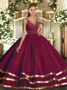 Fashion Burgundy V-neck Neckline Ruching Quinceanera Gown Sleeveless Backless