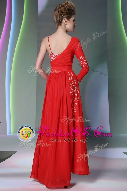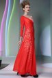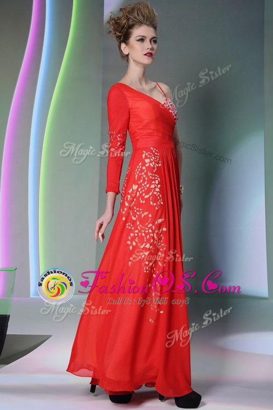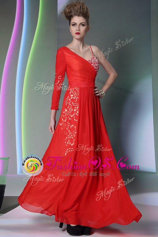 Fashion Coral Red Side Zipper Asymmetric Beading and Embroidery Celebrity Prom Dress Chiffon Long Sleeves