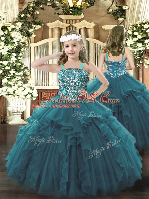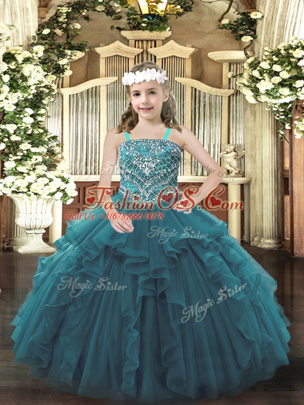 Fashion Organza Straps Sleeveless Lace Up Beading and Ruffles Little Girl Pageant Gowns in Teal