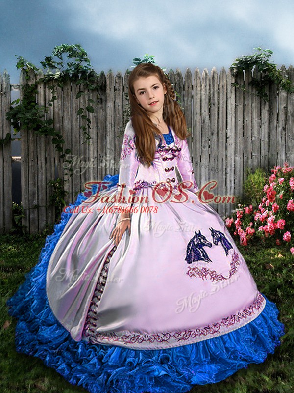 Fashion Straps Sleeveless Little Girls Pageant Dress Sweep Train Embroidery and Ruffles White Satin and Organza