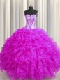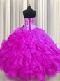 Fashion Visible Boning Beaded Bodice Fuchsia Lace Up Sweetheart Beading and Ruffles Quince Ball Gowns Organza Sleeveless