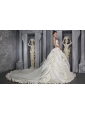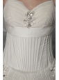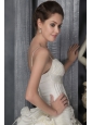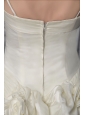 Do you want your wedding dress to be breathtaking? If so, that wedding dress will be your best choice. This dress features two tiny shoulder straps. The ruching on the bust area with the crystals in the middle makes the design so unique. The band under the bust can contures your contures very well. The boning details under the band down to the waist flatter your figure perfectly. And the pleats on the very top of the skirt is another delicate of the dress. The bubbles design on the skirt is so amazing. The train makes the dress more formal and modest. What a gorgeous wedding gown!
