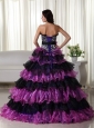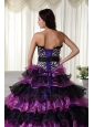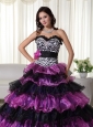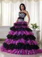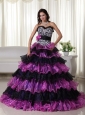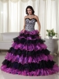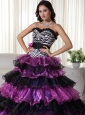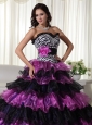 Instill your idyllic ceremony with the fresh fashion of this tulip-tiered zebra print Quinceanera Dress. The strapless bodice features pleated sweetheart neckline embellished with beading and white and black zebra print. A broad, ruched band wraps the waist. An eye-catching floral accent punctuates one side of the fitted waistline. A form-fitted midriff extends to the hips. Graduated, lettuce-edged ruffles riffle to full-length, meeting in curved crossovers along the front to form tulip-hemmed tiers.