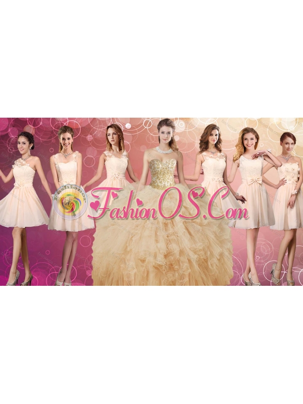 Home >  Quinceanera Dresses >  Quinceaneara Package > Fashionable Beaded and Ruffled Champagne Quinceanera Dress and Discount Short Dama Dresses