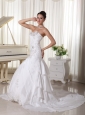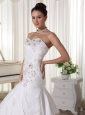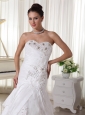 Your wedding gown should be the focal point of the event and all eyes will definitely be on you in this stunning dress. It features beautiful embroidered and beaded floral appliques throughout the bodice and the skirt. Its strapless bodice is encrusted with a wide wraping ruching and a beautiful A-line skirt with layers of fabric that extends into a sweep train in the back. Delicated flowers decorates the dress, giving the dress a charm look. Don't be hesitate, this dress will be the right one for your choice.