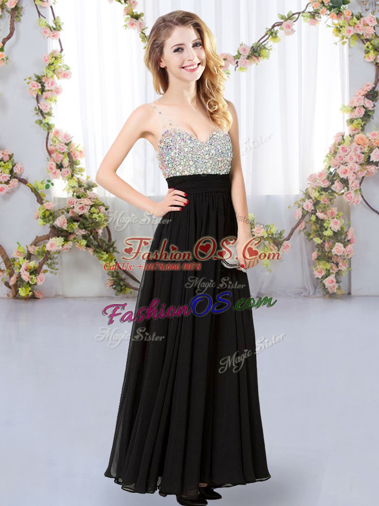 Fashionable Black Empire Chiffon V-neck Sleeveless Beading Floor Length Backless Wedding Party Dress
