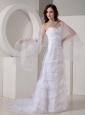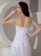 This gorgeous organza wedding dress features strapless sweetheart bodice with beaded floral appliques. The multi-tiered is embellished with beaded appliques that complement the embellishements in the bodice perfectly. If you're longing for the romantic and detailed gowns of yesteryear, this one may be just what you're looking for.