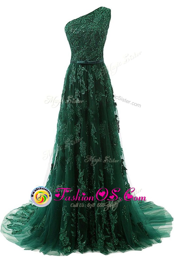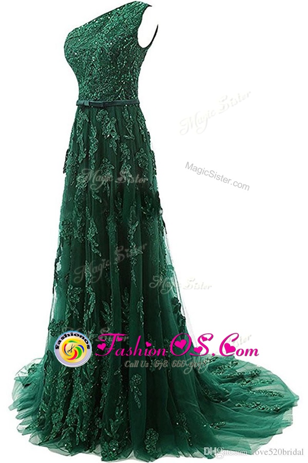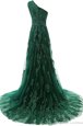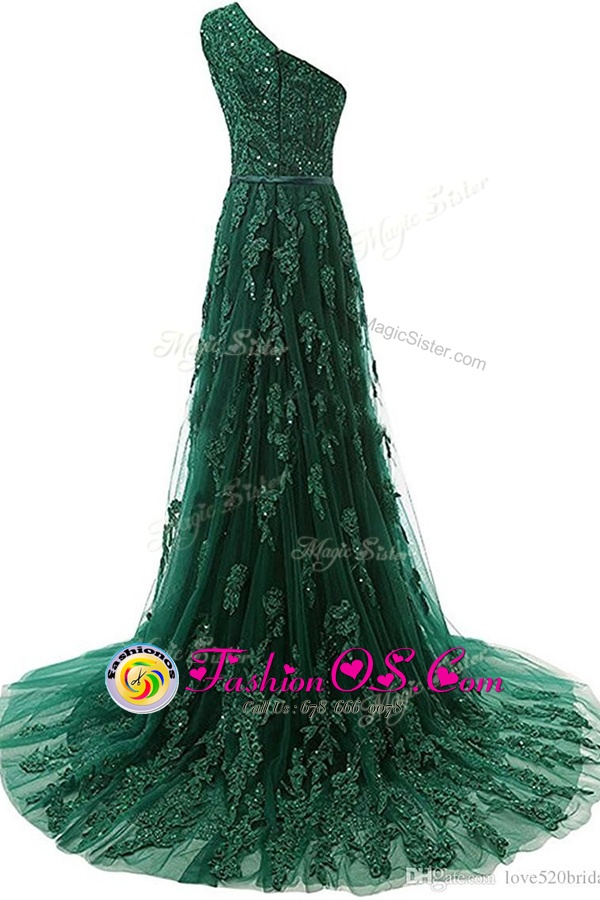 Fashionable Dark Green A-line One Shoulder Sleeveless Tulle Sweep Train Zipper Beading and Appliques Mother Of The Bride Dress