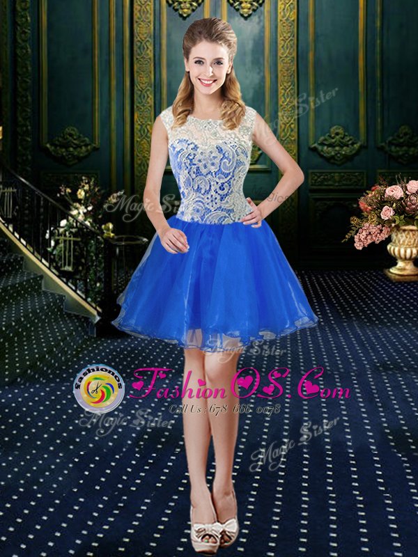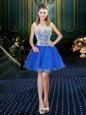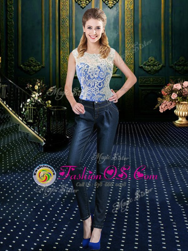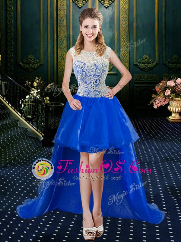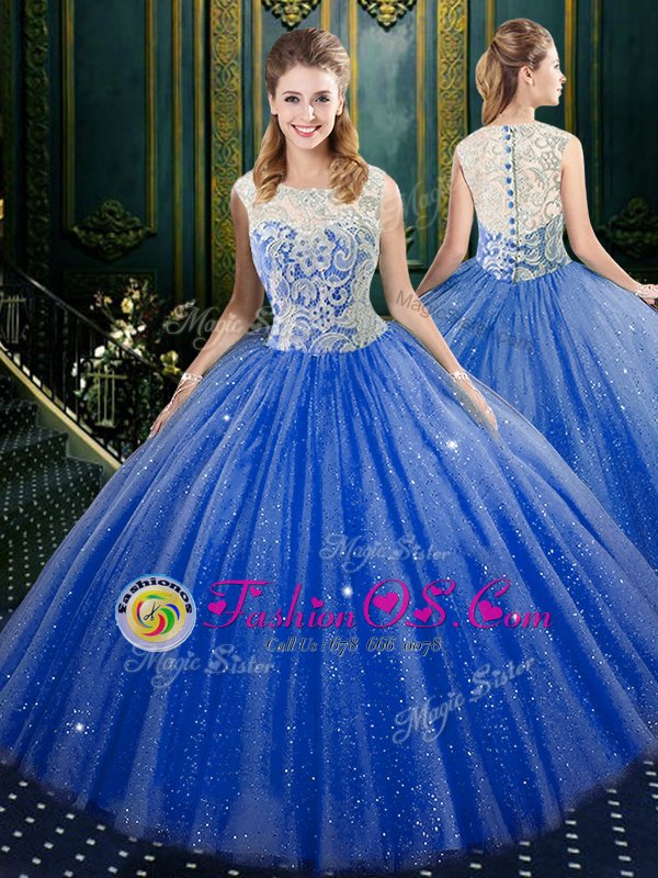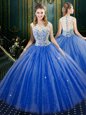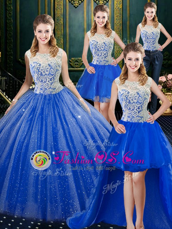 Fashionable Four Piece Royal Blue Tulle Zipper Vestidos de Quinceanera Sleeveless Floor Length Brush Train Lace