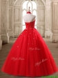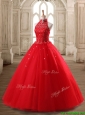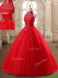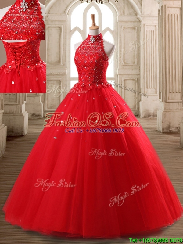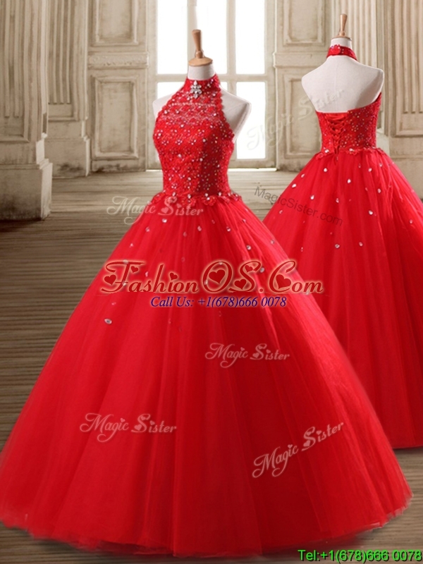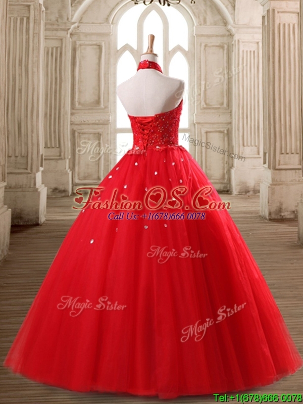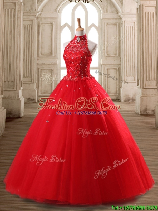 Fashionable Halter Top Beaded Tulle Quinceanera Dress in Red