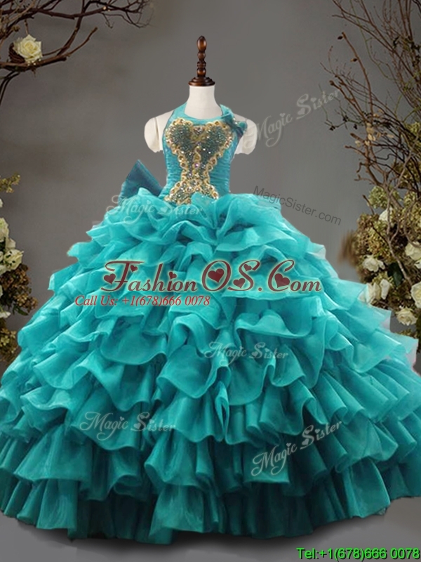 Fashionable Halter Top Teal Quinceanera Dress with Beading and Ruffled Layers