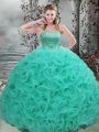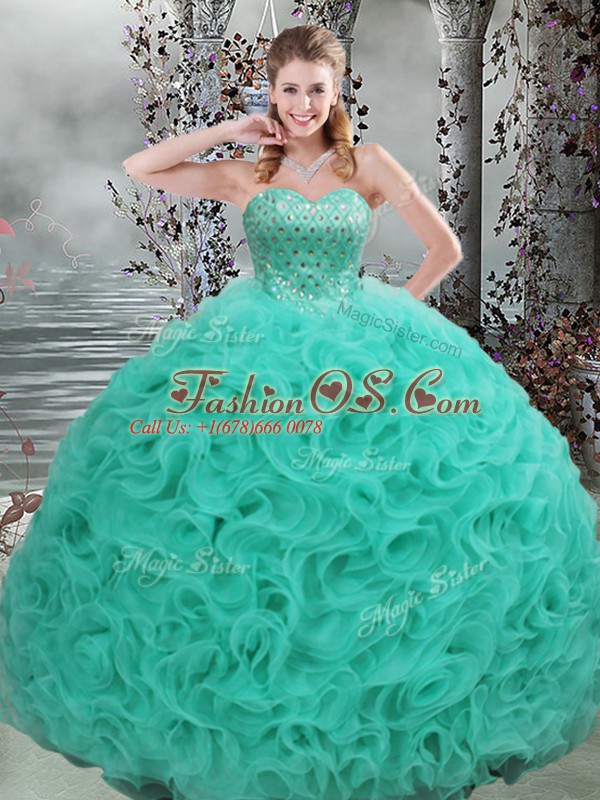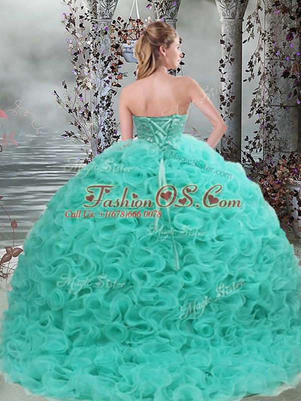 Fashionable Lace Up Ball Gown Prom Dress Turquoise for Military Ball and Sweet 16 and Quinceanera with Beading Brush Train