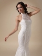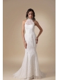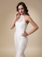 This wonderful wedding dress is accented with a halter top specialized by lace fabric to cover the chest and the mermaid skirt starting from hugging-body waist with a brush train overlayed with beautiful lace, which adds your elegance and upgrades your taste. A hidden zipper makes for easy off and on and secures the dress in place.