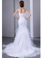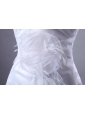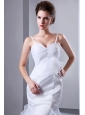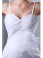 Have you ever experienced the feeling of being a princess? This white dress will make your dream come true. The sweetheart neckline style bodice is accented with spaghetti straps and symmetrical ruchings, while the unique feather decoration makes this design more elegant and sophsicated that you will gain more attention. The mermaid skirt in contrasting fabric will embody much more retouch to create a beautiful court train in the back. A hidden zipper up completes this fabulous design finally.
