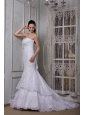 You'll be the most beautiful bride in this glamorous wedding dress. Exquisite beadwork glimmers at the strapless neckline and form-fitting bodice for a richly embellished elegance, while can show your natural waistline.The layered, mermaid style skirt flares with feathery grace to create a beautiful court train. The back completes with an adjustable lace up.