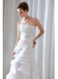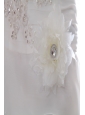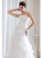Go for a charming, feminine look on your wedding day in this pretty gorgeous dress . This strapless dress has a strapless neckline and pleating through the bodice. A contrasting band wraps the waist and the hip and a large flower sits at one side. Delicate appliques daccents on the dress to get a fantastic effect. The skirt has a distinct A-line shape and fluttering tiers of ruffles for a soft, romantic look. This gown is full length. A lace up corset style closure in the back secures the dress in place.