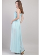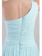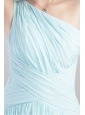 This pretty blue one shoulder prom dress is featured with ruched bodice and the ruched bands criss corssed at the waist.And the one layer chiifon gives a dreamlike feel. A lovely dress for your special date.