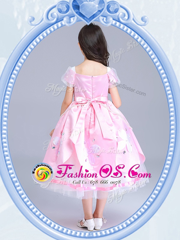 Fashionable Square Baby Pink Short Sleeves Beading and Appliques Tea Length Flower Girl Dresses