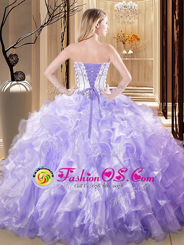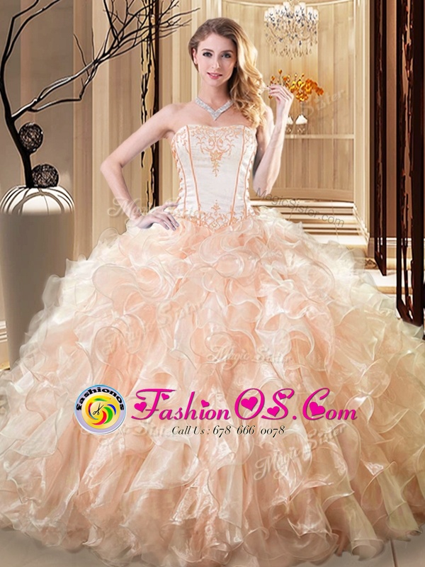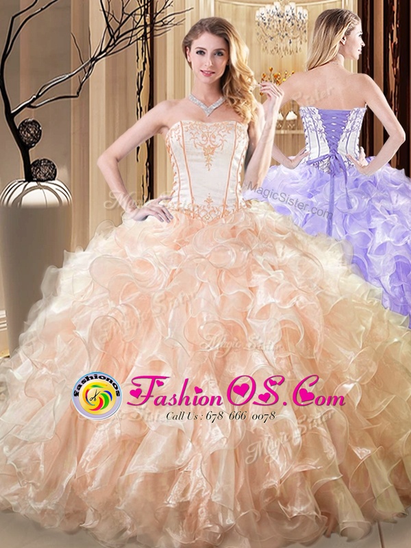 Fashionable Strapless Sleeveless Sweet 16 Quinceanera Dress Floor Length Embroidery and Ruffles Yellow Organza