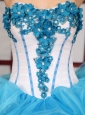 This auqa blue wedding dress is so gorgeous and subdued that you will attract the attention of the crowd. The fitted, strapless bodice is adorned with the wonderful hand made flowers and clear beadings. The symmetrical vertical lines beautify this stunning design. The floor length bouffant skirt with pick-ups flows freely to extend a chapel train and a corset back completes the look.