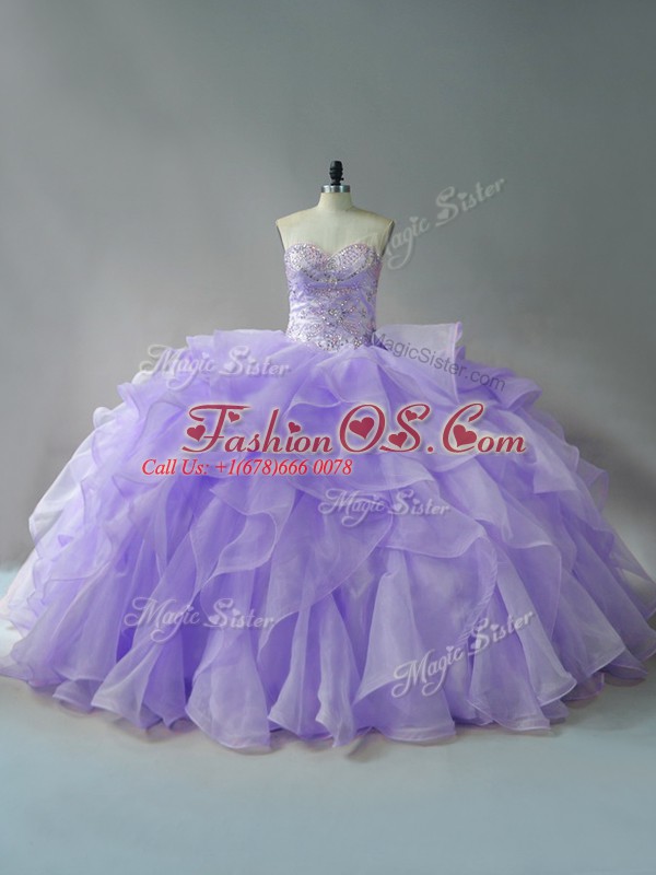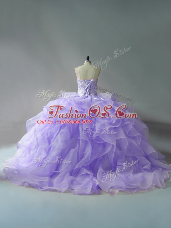 Fashionable Sweetheart Sleeveless Sweet 16 Dresses Brush Train Beading and Ruffles Lavender Organza