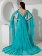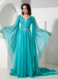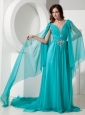 Fashionable Turquoise Empire V-neck Evening Dress Chiffon Beading Court Train