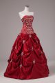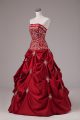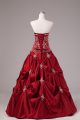 Fashionable Wine Red Lace Up Strapless Embroidery and Pick Ups Sweet 16 Dresses Taffeta Sleeveless