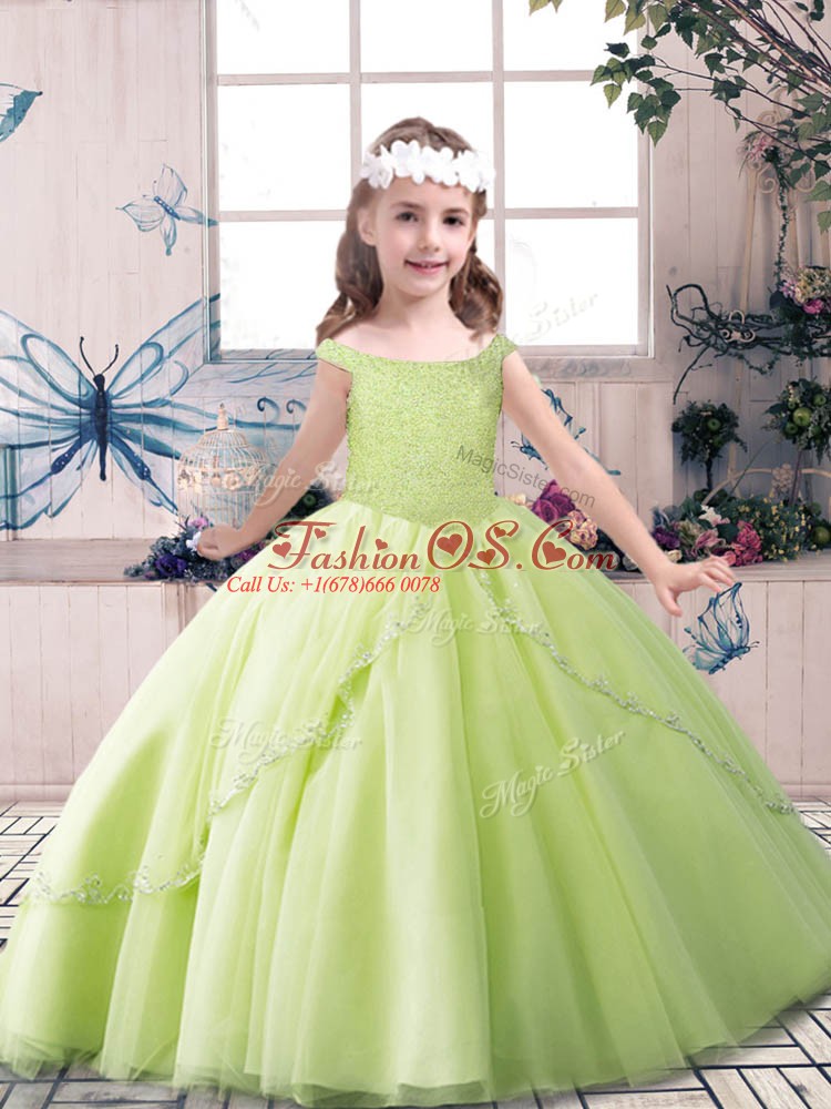 Fashionable Yellow Green and Pink And White Kids Pageant Dress Party and Wedding Party with Beading Off The Shoulder Sleeveless Lace Up