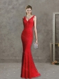 Feminine Deep V Neckline Red Mother of the Bride Dress with Lace
