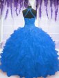 Fine Blue Organza Zipper Ball Gown Prom Dress Sleeveless Floor Length Beading and Ruffles