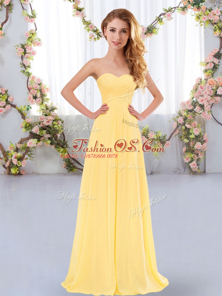 Fine Floor Length Lace Up Dama Dress Gold for Wedding Party with Ruching