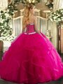Fine Fuchsia Quince Ball Gowns Military Ball and Sweet 16 and Quinceanera with Appliques and Ruffles Sweetheart Sleeveless Lace Up