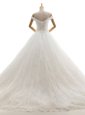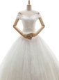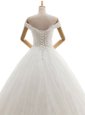 Fine Off the Shoulder White A-line Lace and Appliques Wedding Gown Lace Up Tulle Sleeveless With Train