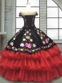 Fine Red And Black 15 Quinceanera Dress Military Ball and Sweet 16 and Quinceanera with Embroidery and Ruffled Layers Off The Shoulder Sleeveless Lace Up