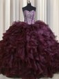 Fine Visible Boning Sleeveless Brush Train Lace Up With Train Beading and Ruffles Quince Ball Gowns