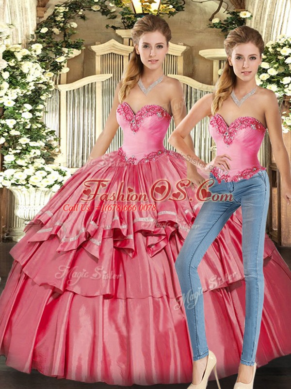 Fine Watermelon Red Two Pieces Beading and Ruffled Layers 15th Birthday Dress Lace Up Organza Sleeveless Floor Length