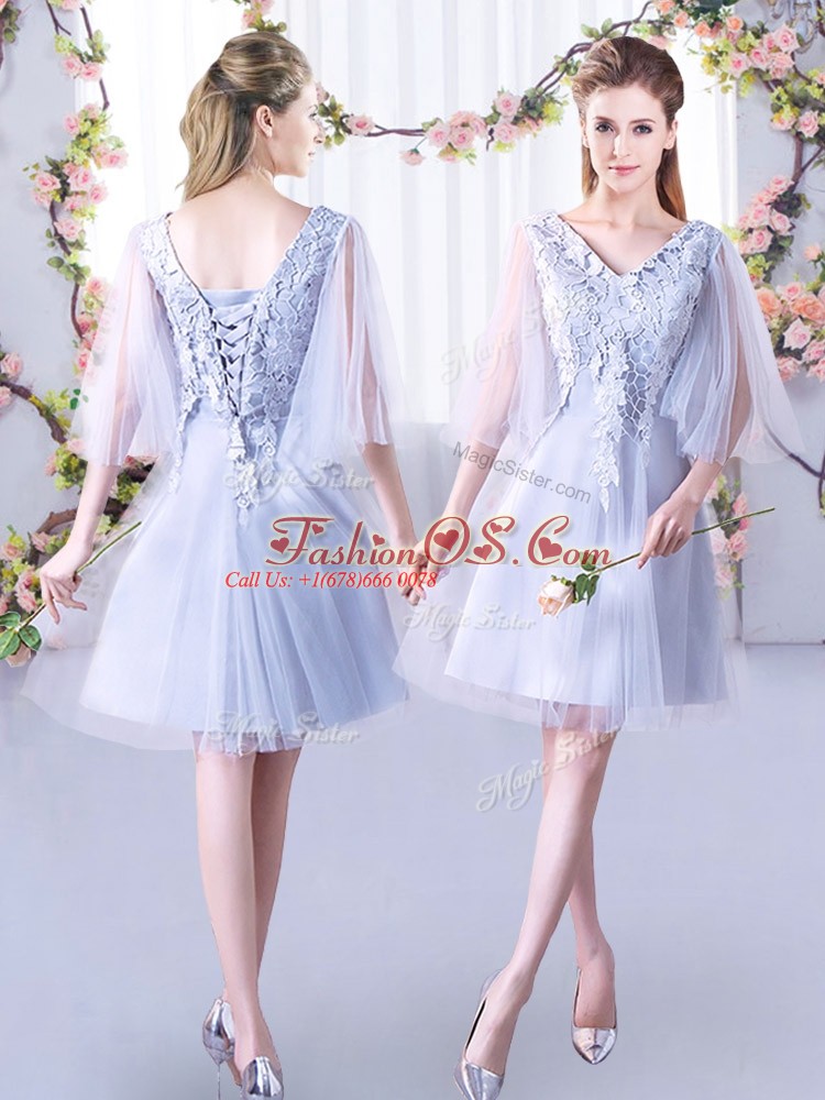 Fitting A-line Bridesmaid Gown Grey V-neck Tulle Sleeveless Mini Length Lace Up