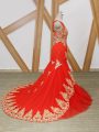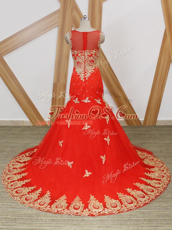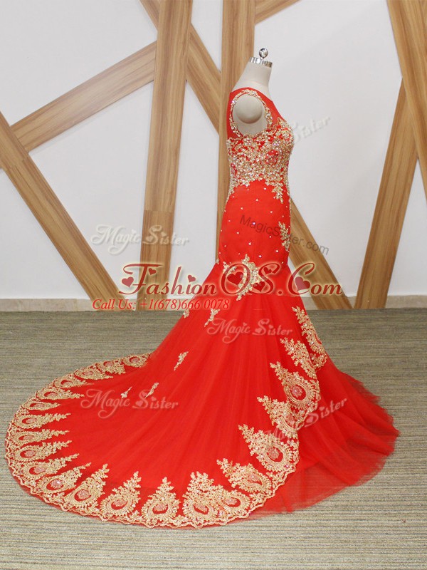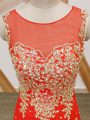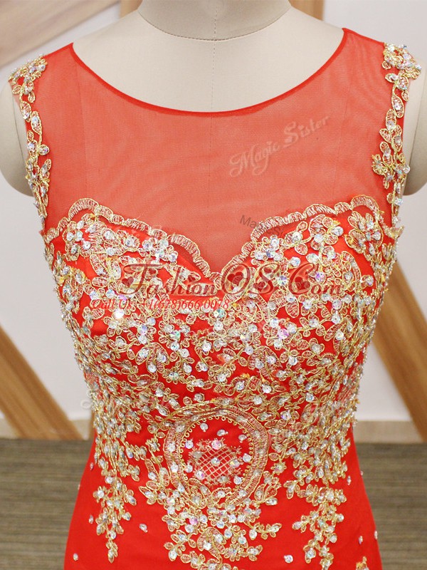 Fitting Beading and Lace and Appliques Homecoming Dress Coral Red Zipper Sleeveless Brush Train