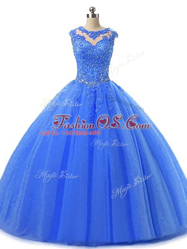 Fitting Blue Ball Gowns Tulle Scoop Sleeveless Beading and Lace Floor Length Lace Up Vestidos de Quinceanera