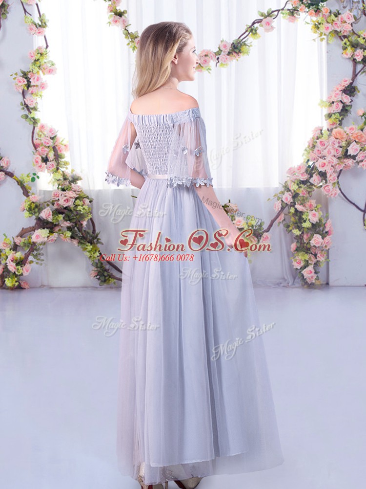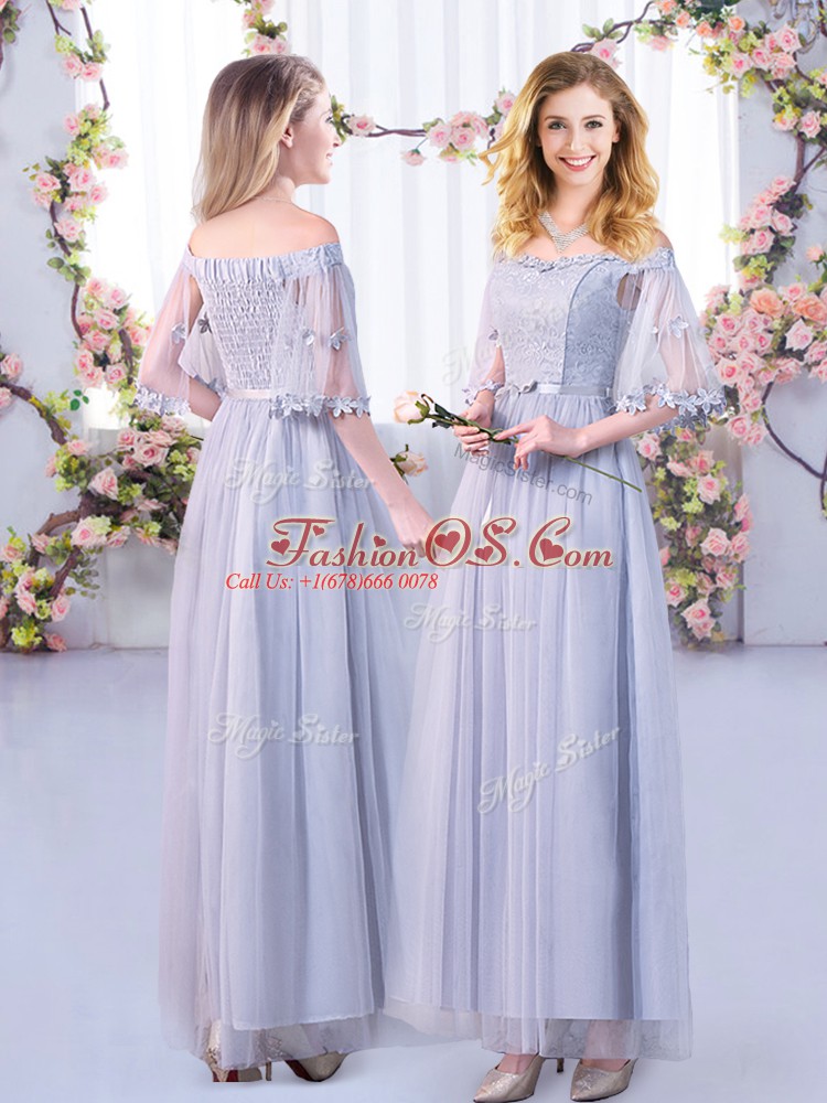 Fitting Half Sleeves Floor Length Lace and Belt Side Zipper Wedding Party Dress with Grey