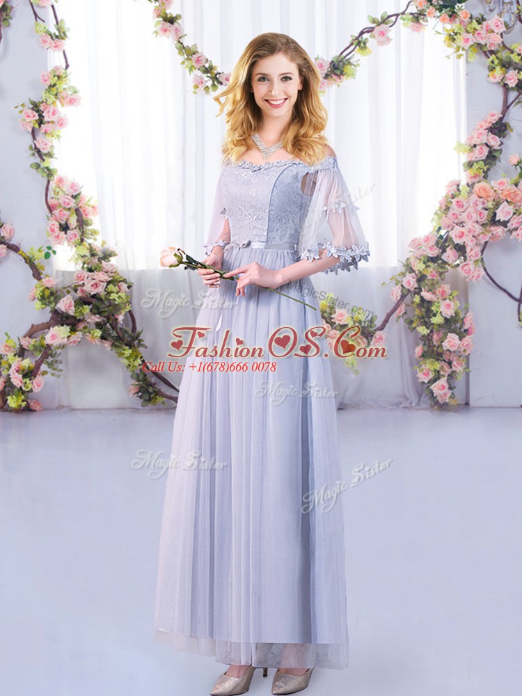 Home >  Bridesmaid Dresses >  Simple Bridesmaid Dresses > Fitting Half Sleeves Floor Length Lace and Belt Side Zipper Wedding Party Dress with Grey
